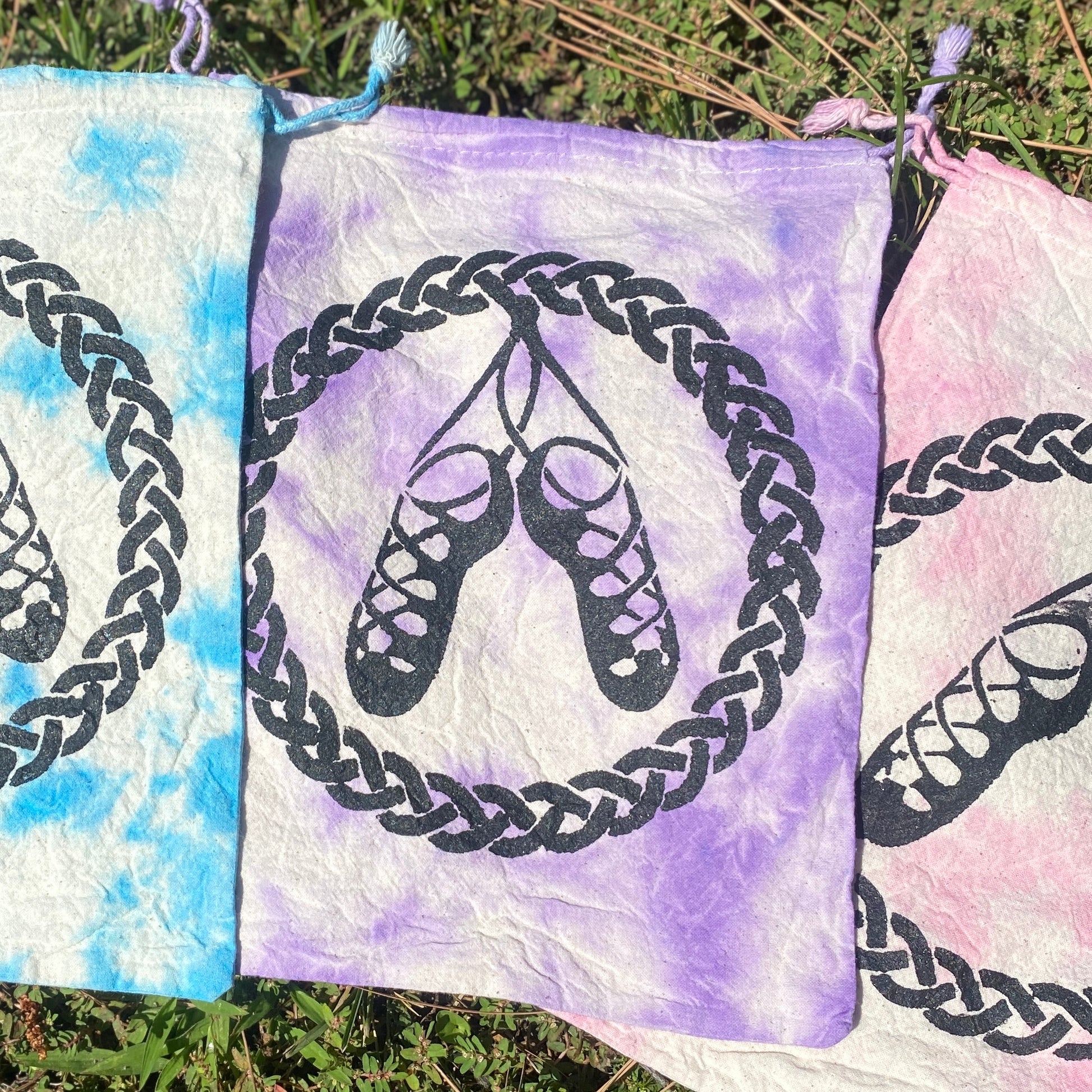 Tired of not being able to find the important things in you dance bag? Search no further! Our colorful bags allow you to find your small necessities quickly. The unique tie-dye design with ghillies, hard shoes, or shamrock is perfect for the fun loving Irish Dancer in your life. Bag size is approximately 9”x 14” and can easily store an adult size pair of hard shoes and Soft shoes. Exact bag color may vary due to the nature of the tie-dying process.